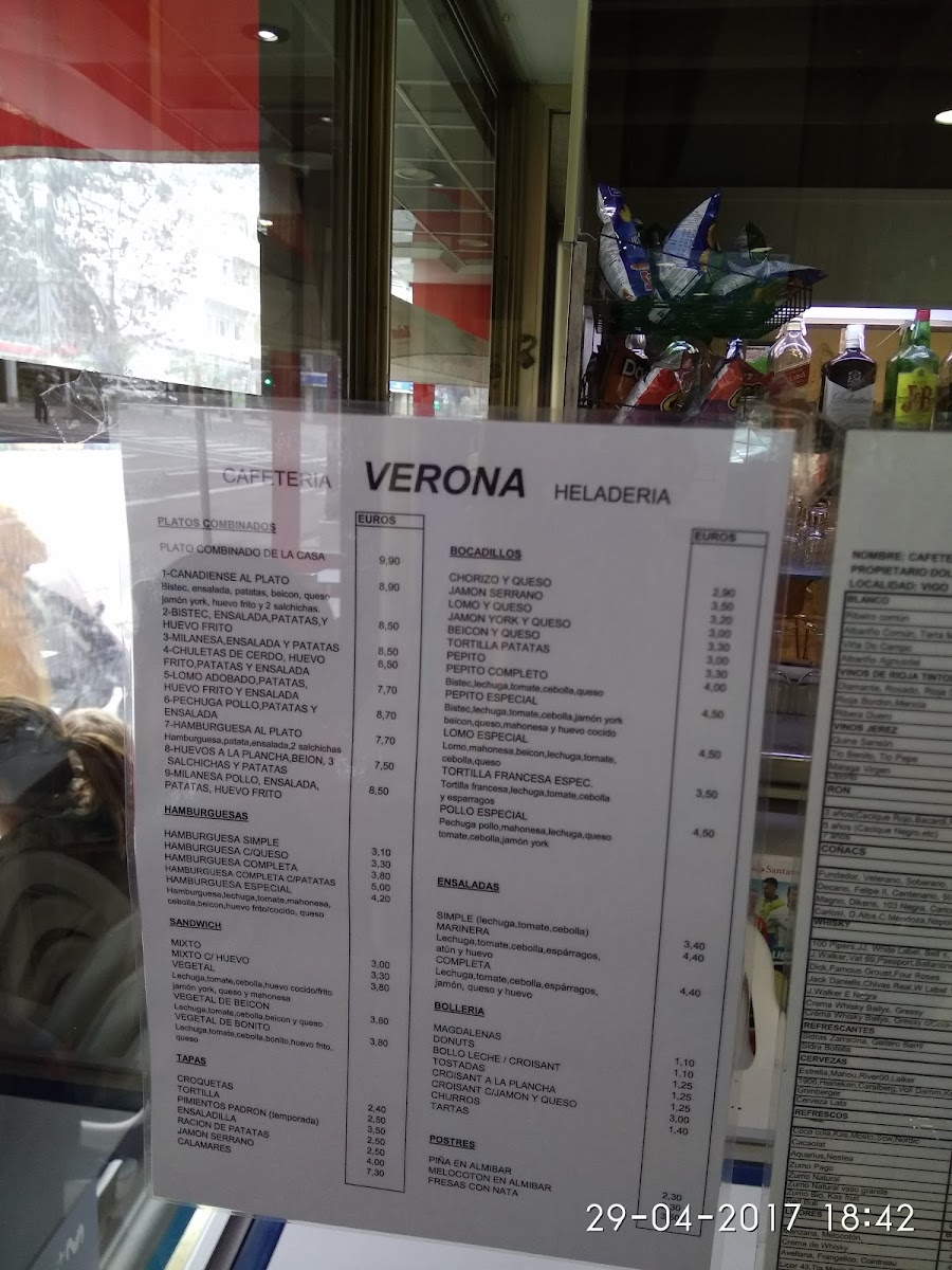 Welcome to Verona. CAFETERIA, a charming spot nestled in the heart of Santiago de Vigo. This cafe blends the warmth of a breakfast restaurant, a coffee shop, and a casual dining experience all in one inviting space. The menu is a delightful mix of simplicity and flavor, perfect for a quick bite or a leisurely snack. Highlights include the beloved potato bombas, known for their savory goodness, alongside fresh burgers and sandwiches that have garnered rave reviews from both locals and visitors.